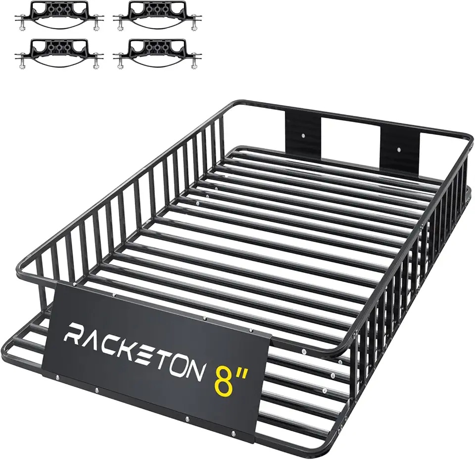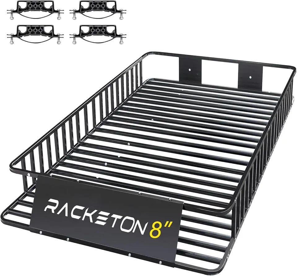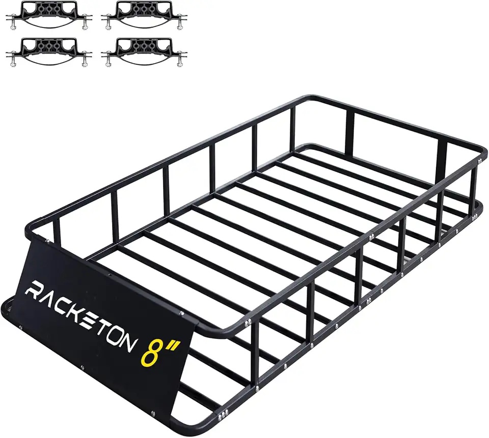 74”x39”x8” roof rack for SUVs and trucks offers ample storage with anti-rust coating. Strong construction handles weight; easy to mount. Ideal for road trips, moving, or hauling gear – durable, weather-resistant top carrier.